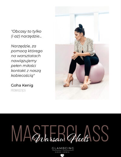 Twórczyni i prowadząca GlamBeing oraz autorski cykl warsztatów pewności siebie dla kobiet Warsaw Heels Masterclass, które zadebiutowały w lipcu 2025 r.