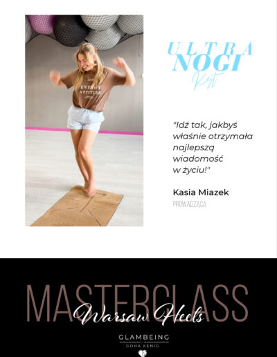 Specjalnie na potrzeby Warsaw Heels Masterclass Kasia przygotowała dla nas autorski program treningu ciała i umysłu ULTRANOGI, który został zaprojektowany tak, żeby pomóc nam wzmocnić mięśnie odpowiedzialne za bezpieczne poruszanie się na obcasach oraz ścieżki neuronowe odpowiedzialne za to, żebyśmy czuły się przy tym pewnie i kobieco!